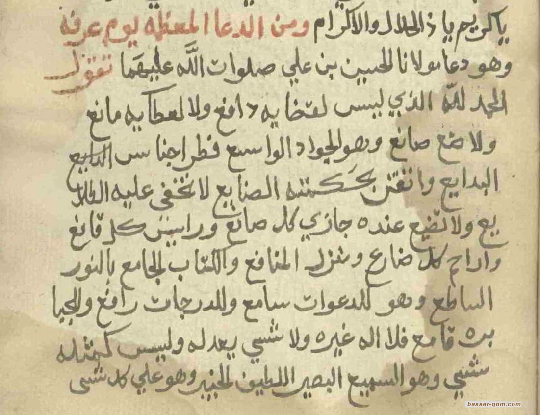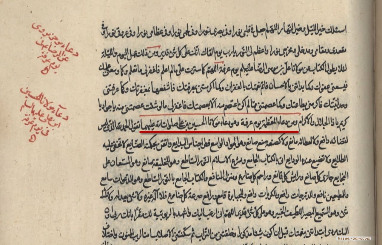 ونقل الشيخO الدّعاء ولم يورد تلك الفقرة، بل جاء في آخرها ما يؤكِّد على انتهاء دعاء سيّد الشهداءg إلى ذلك الحدِّ، فقد جاء بعد خاتمة الدعاء ما نصّه: (قال بشر وبشير: فلم يكن لهg جهدٌ إلّا قوله: «يا ربّ يا ربّ» بعد هذا الدعاء، وشُغل من حضر ممن كان حوله وشهد ذلك المحضر عن الدعاء لأنفسهم، وأقبلوا على الاستماع لهg والتأمين على دعائه، قد اقتصروا على ذلك لأنفسهم، ثم عَلَتْ أصواتهم بالبكاء معه وغربت الشمس وأفاضg وأفاض النّاسُ معه)[11].